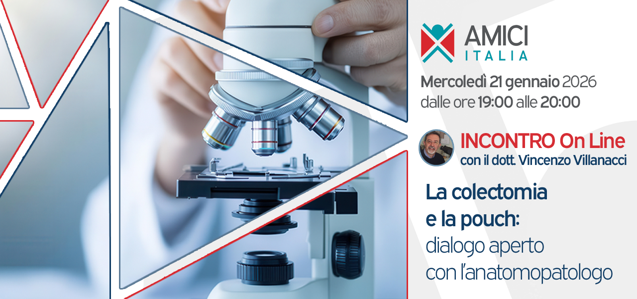 Mercoledì 21 gennaio 2026, dalle 19:00 alle 20:00, AMICI Italia propone un incontro online dal titolo “La colectomia e la pouch: dialogo aperto con l’anatomopatologo”, un appuntamento pensato per offrire informazioni chiare e spazio alle domande su un tema centrale per molte persone con MICI.