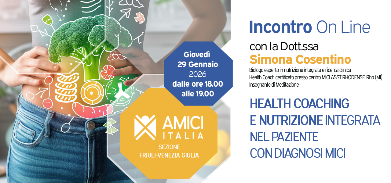 AMICI Italia – Sezione Friuli Venezia Giulia organizza un nuovo incontro online dedicato alle persone con Malattie Infiammatorie Croniche Intestinali, con un focus su health coaching e nutrizione integrata come strumenti di supporto nel percorso di cura.