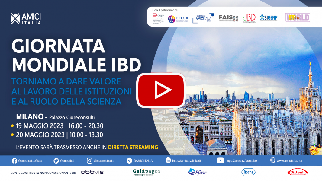 Riproponiamo la registrazione integrale dell’evento GIORNATA MONDIALE IBD : TORNIAMO A DARE VALORE AL LAVORO DELLE ISTITUZIONI E AL RUOLO DELLA SCIENZA che si è svolto a Milano - Sala Terrazzo - Palazzo Giureconsulti il 19 e 20 Maggio 2023