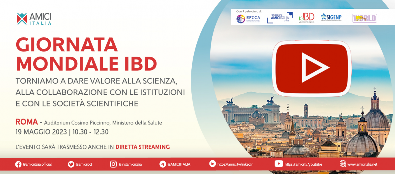 Riproponiamo la registrazione integrale e la rassegna stampa relativa all’evento GIORNATA MONDIALE IBD: TORNIAMO A DARE VALORE ALLA SCIENZA, ALLA COLLABORAZIONE CON LE ISTITUZIONI E CON LE SOCIETÀ SCIENTIFICHE che si è svolto a ROMA il 19 MAGGIO 2023 presso Auditorium Cosimo Piccinno Ministero della Salute