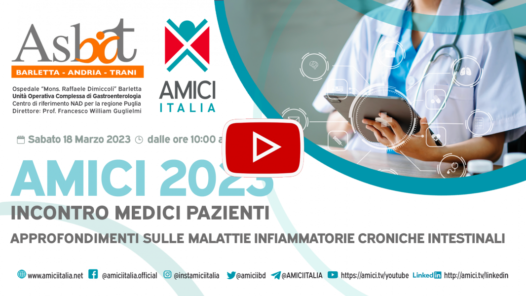 Pubblichiamo la registrazione dell’incontro medici-pazienti "Approfondimenti sulle Malattie Infiammatorie Croniche dell'Intestino" che si è svolto sabato 18 Marzo 2023 a Barletta presso l'Ospedale "Mons. Raffaele Dimiccoli"