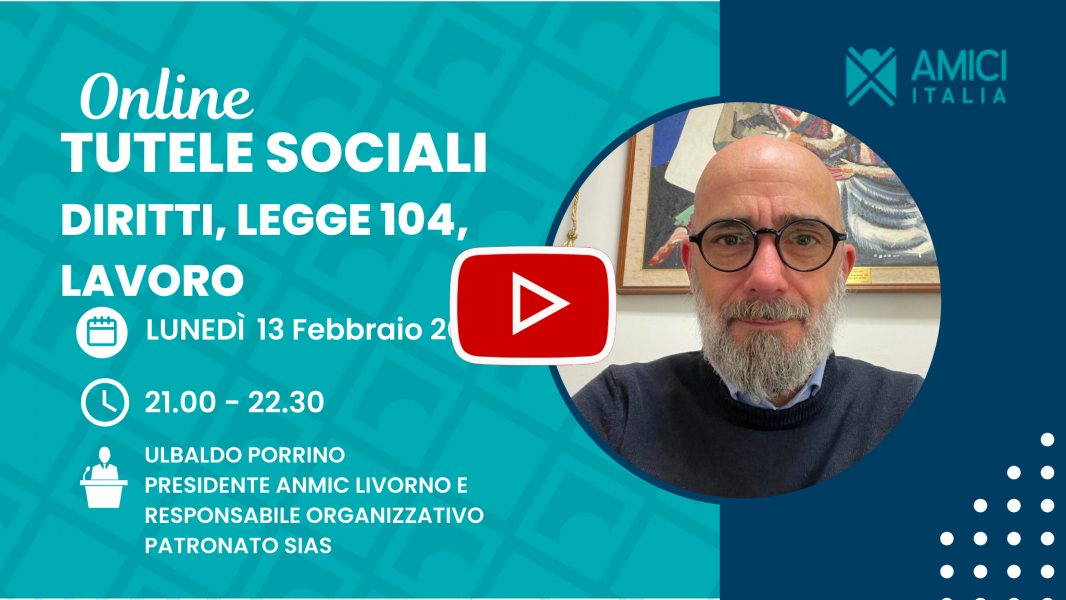 Pubblichiamo la registrazione del webinar "Tutele sociali e invalidità per i pazienti cronici" con il Dott. Ubaldo Porrino, Presidente Provinciale ANMIC Livorno e Responsabile Organizzativo Patronato SIAS, esperto in tutele sociali e richieste di invalidità, che ha parlato di opportunità in questo ambito per i pazienti affetti da malattie infiammatorie croniche dell'intestino.