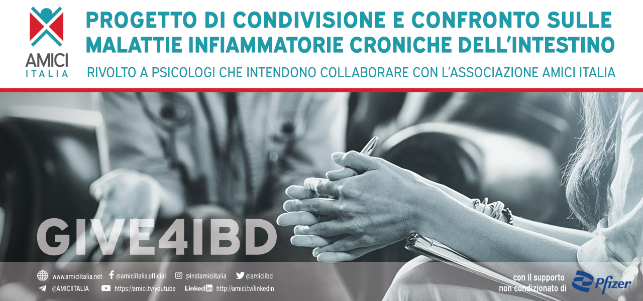 Proponiamo a tutti gli psicologi interessati, la partecipazione gratuita a 6 incontri di crescita, condivisione e confronto sulle Malattie Infiammatorie Croniche dell’Intestino, con l’obiettivo di diffondere una maggiore conoscenza dell’ambito delle IBD e per creare una rete nazionale dedicata ai pazienti che AMICI Italia rappresenta.