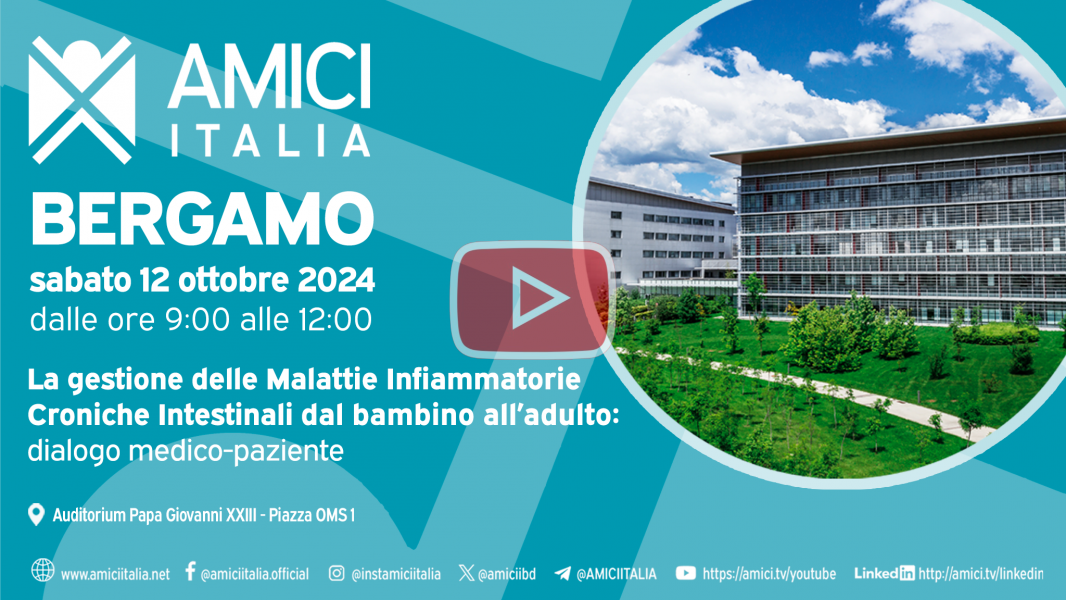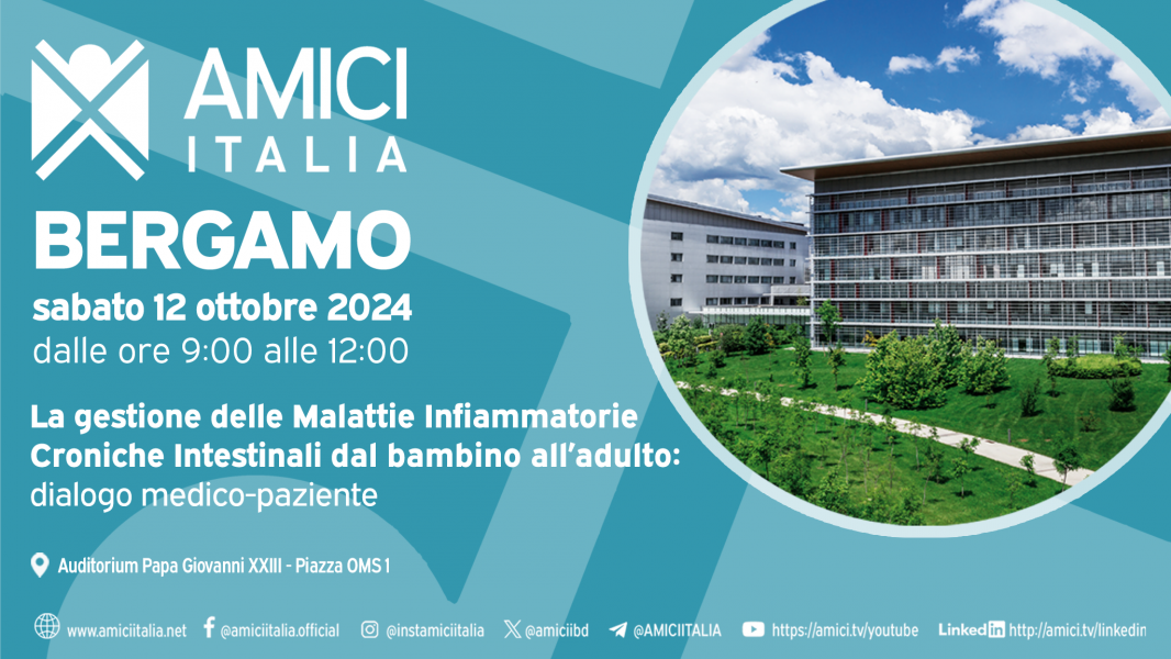 Sabato 12 ottobre 2024 alle ore 9 a Bergamo presso Auditorium Papa Giovanni XXIII Piazza OMS 1 incontro medici-pazienti “La gestione delle Malattie Infiammatorie Croniche Intestinali dal bambino all’adulto: dialogo medico-paziente”